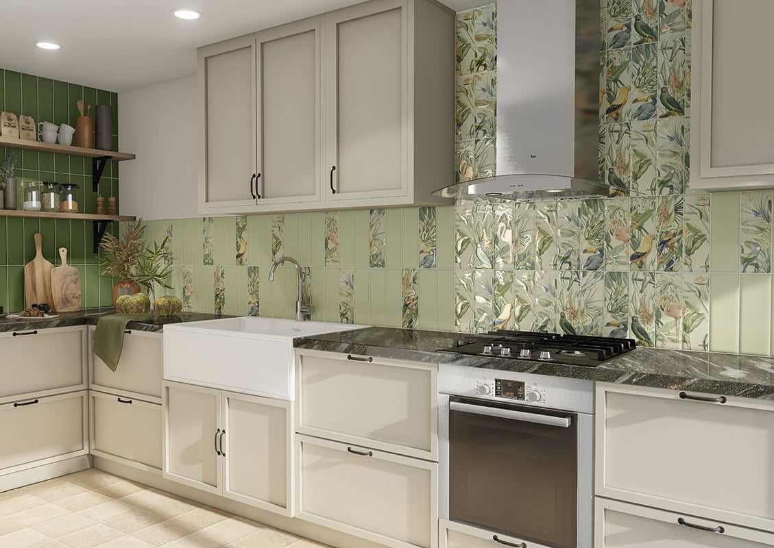 Плитка выполнена в природной палитре: насыщенные зелёные и терракотовые оттенки гармонично сочетаются с мягкими песочными и кремовыми тонами. Богатый растительный узор, вдохновлённый дикой природой и атмосферой Прованса, придаёт коллекции изысканный характер.