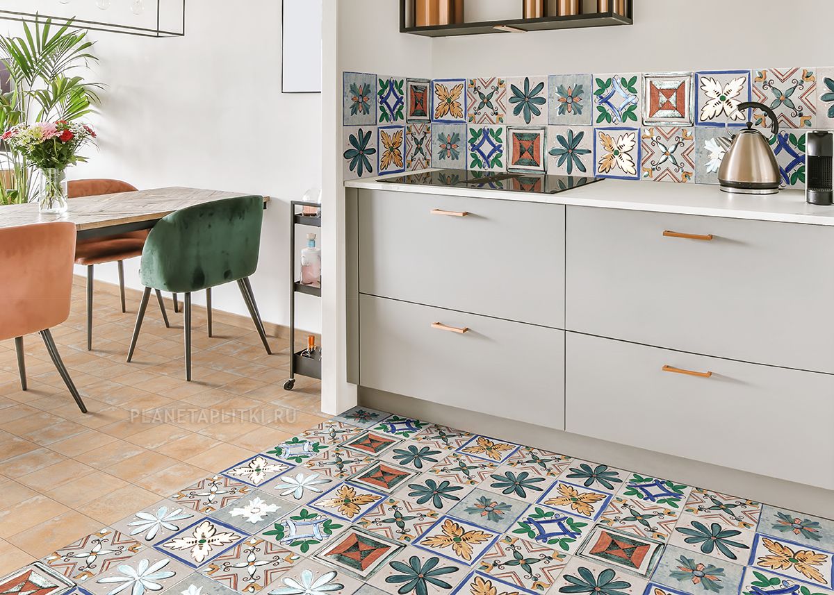 Декор Mainzu Portocervo выполнен в виде классической квадратной плитки с универсальными размерами 20х20 см. Тактильно приятная сатинированная обработка элементов подчеркивает и усиливает привлекательность нарочито неровной поверхности, придавая ей реалистичное сходство со средиземноморским прообразом. Благодаря сочетанию растительных и геометрических орнаментов, стилизованных под традиционную ручную роспись, каждый фрагмент выглядит оригинально и неповторимо, гарантируя великолепную индивидуальность отделки.
