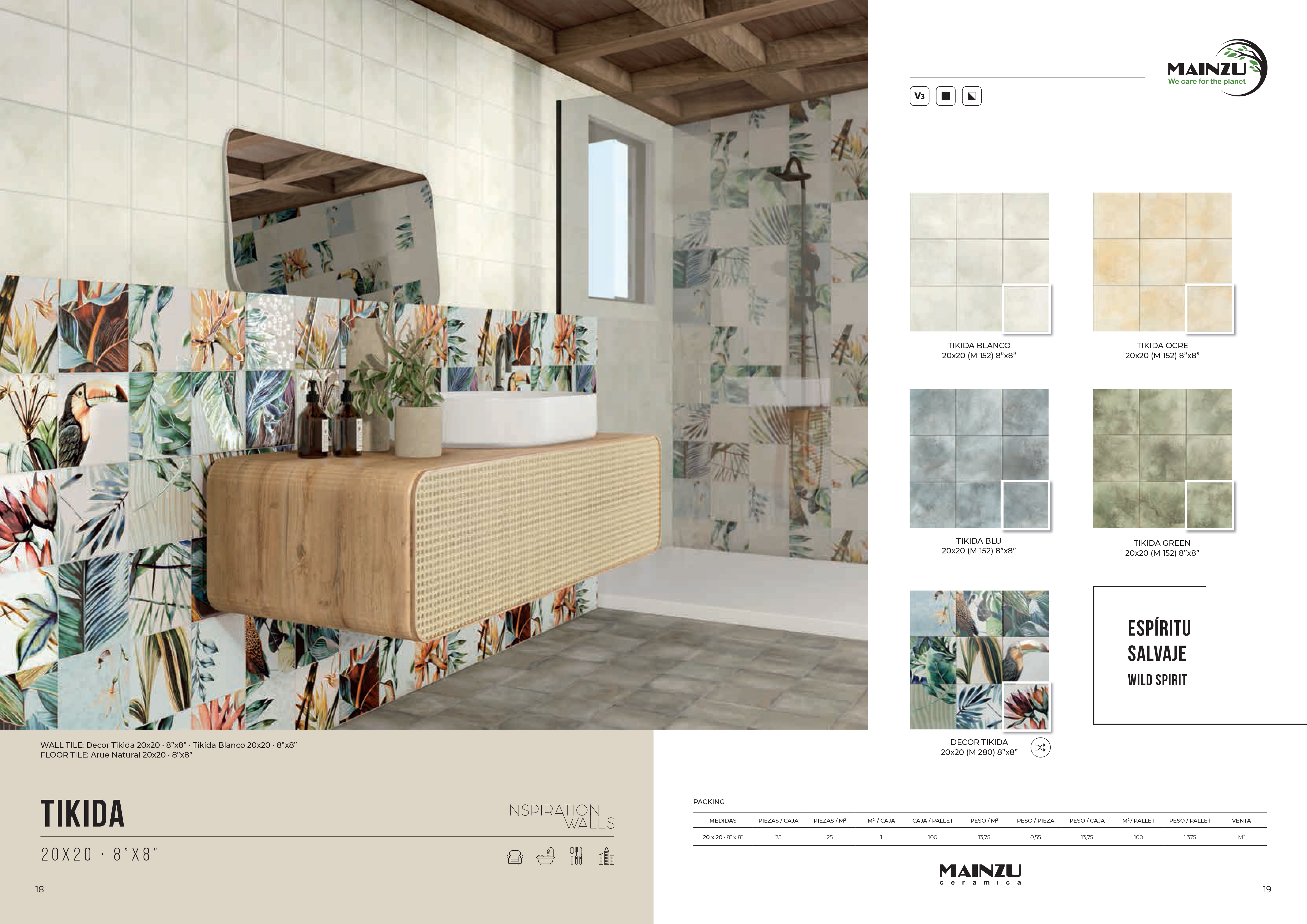 Коллекция делится на фоновые линейки и декоративные элементы. В качестве базовой облицовки производитель предлагает использовать однотонную сатинированную плитку в практичном формате 20х20 см. Палитра, имитирующая бетонную поверхность, кажется нарочито неоднородной и от этого особенно естественной и уютной. Оттенки Mainzu Tikida включают модную припыленно-голубую гамму Blu, теплые охряные тона Ocre, благородный травяной цвет Green и визуально дорогой выбеленный вариант Blanco.