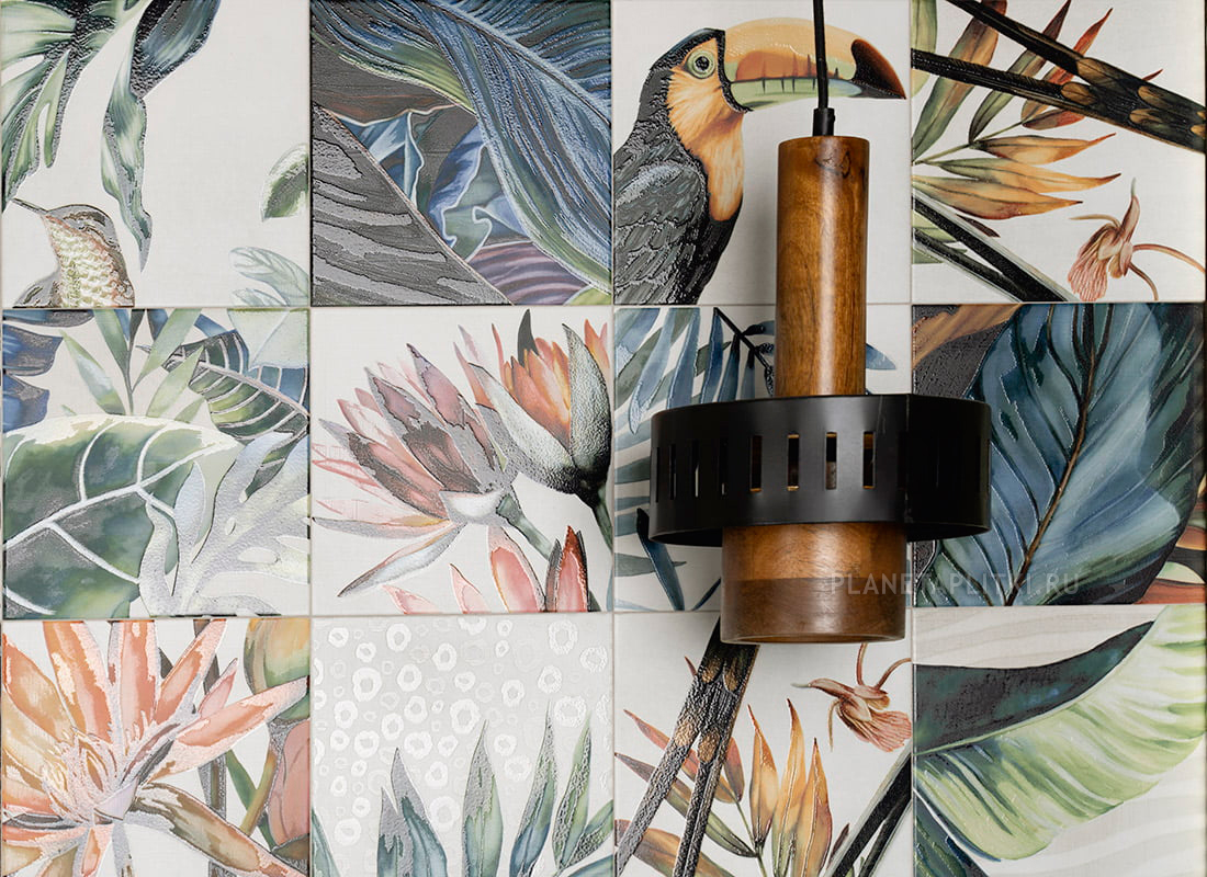 В декоративной линейке Mainzu Decor Tikida разворачивается широчайшее разнообразие тропических паттернов: от ставших уже привычными фрагментов листьев, стеблей и веток, до невероятных фантазийных цветов и редких птиц. Вне зависимости от линейки все элементы легко комбинируются между собой, что открывает бесконечные возможности для дизайна.