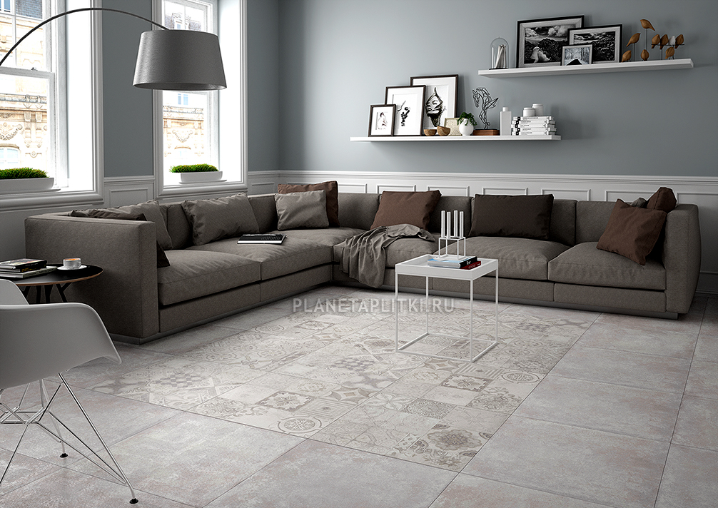 Идея напольной испанской плитки Pamesa Atrium Urbino-Utica заключается в возможности комбинировать неброскую текстуру и пастельные оттенки одной серии с замысловатой абстракцией и более холодной палитрой другой. Формат 60х60, помимо своей трендовости, позволяет оформлять интерьеры с минимумом швов, причём максимально быстро.