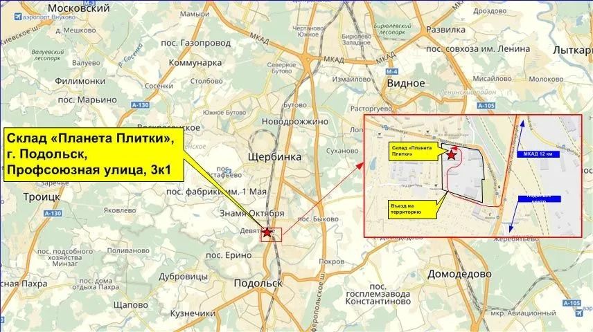 Возможен самовывоз заказа со склада в г. Подольск (ул. Профсоюзная, д. 3, к. 1) или из салона-магазина "Планета Плитки" по адресу: Нахимовский пр-т, д. 50. Подробности уточняйте у менеджеров.